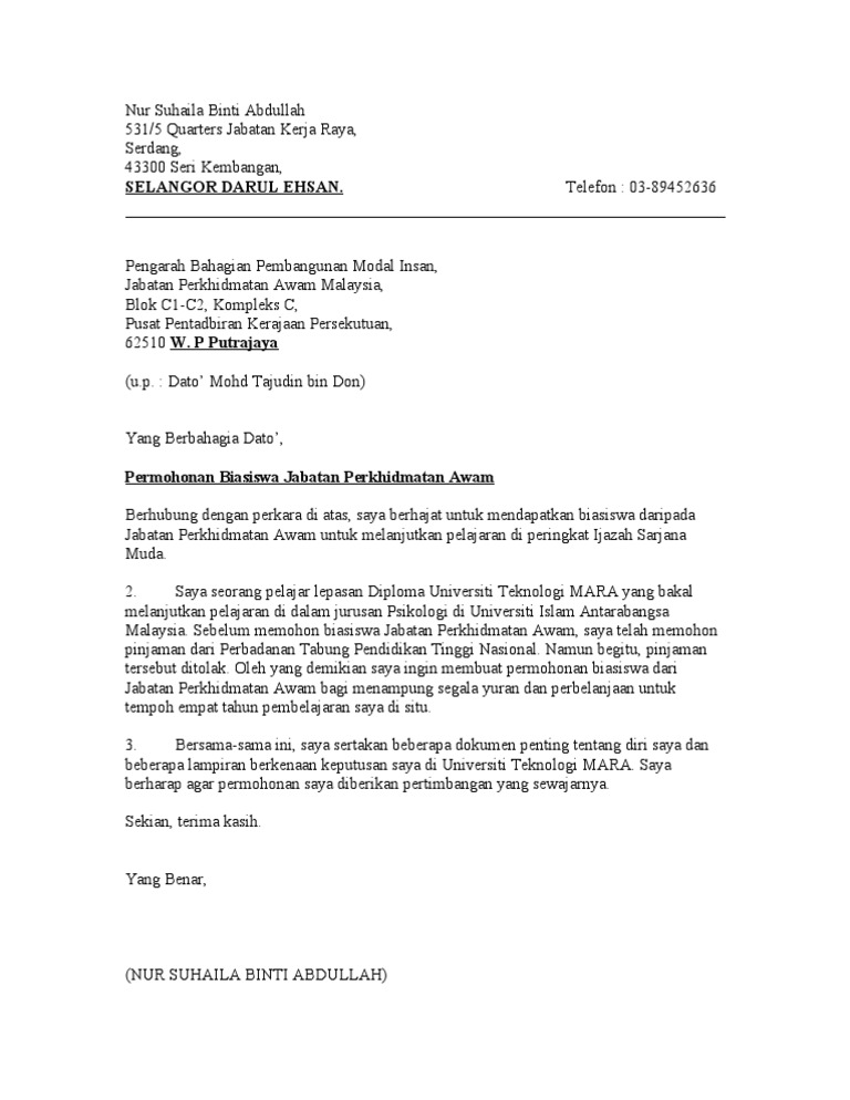 Contoh Surat Rasmi Permohonan Biasiswa Jpa